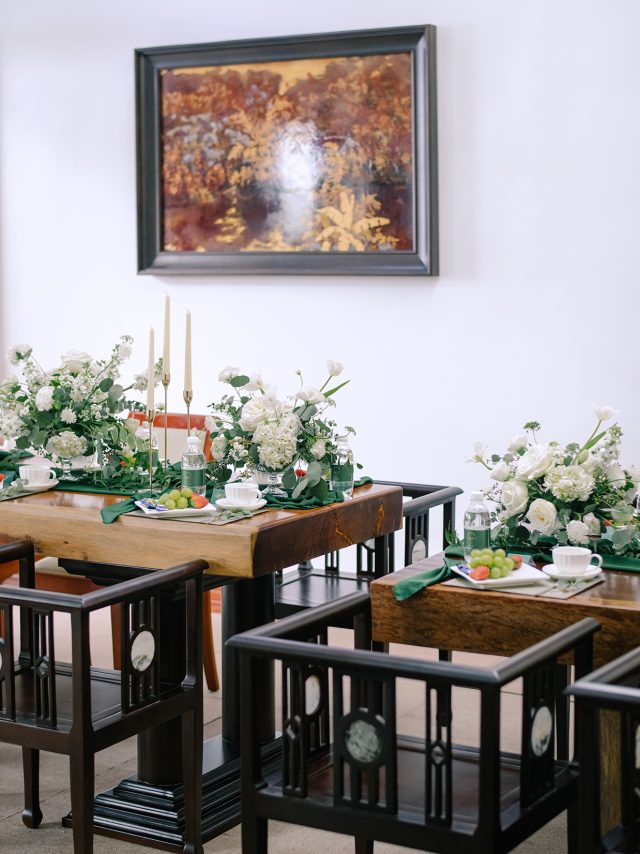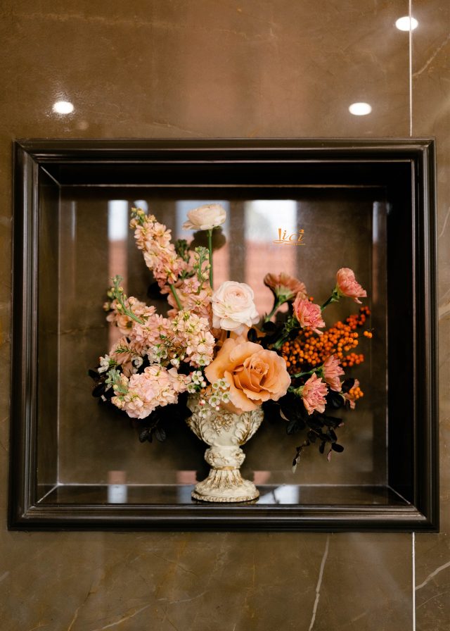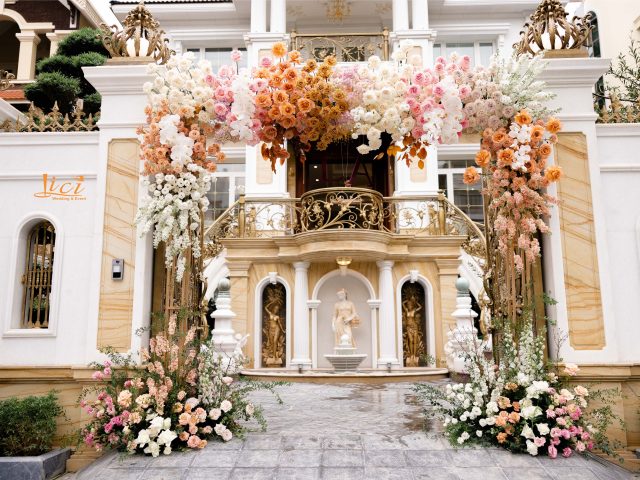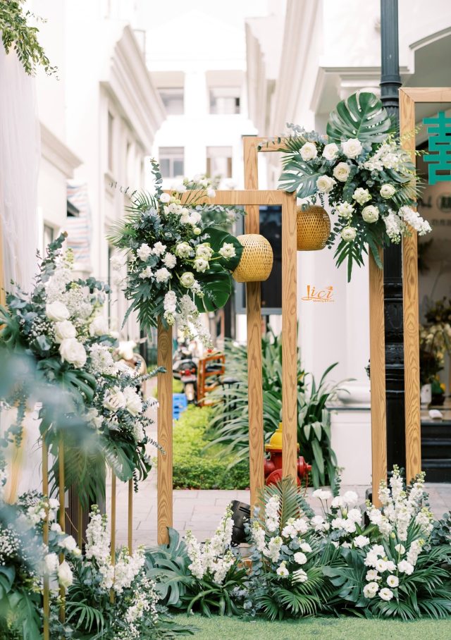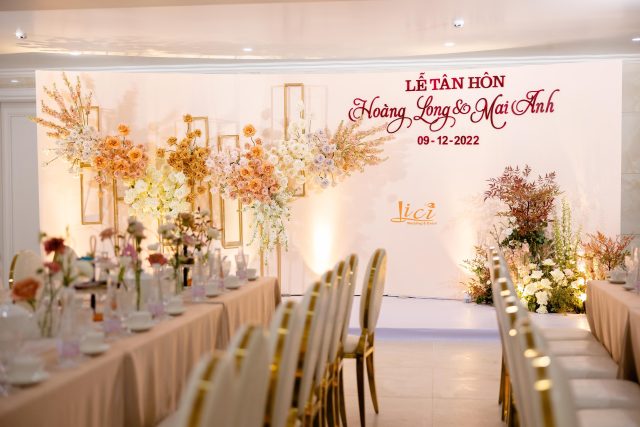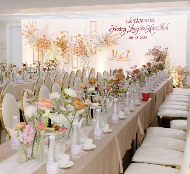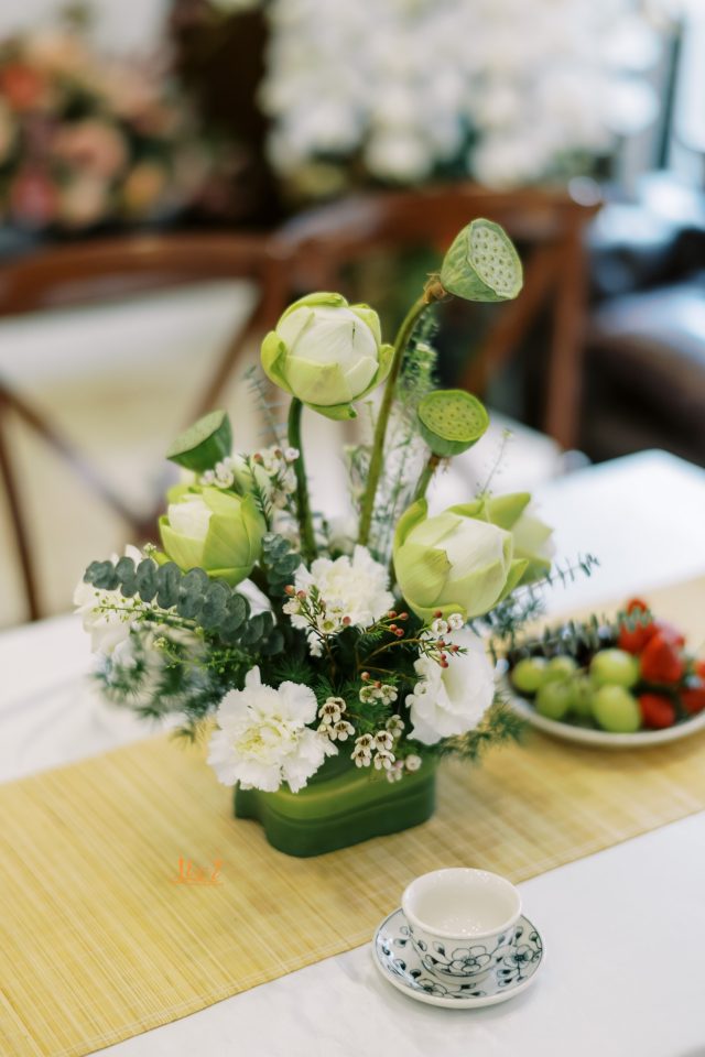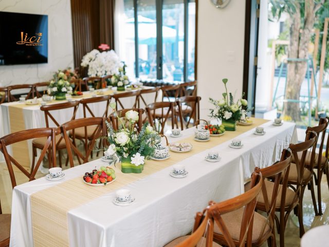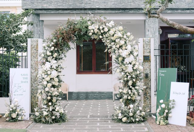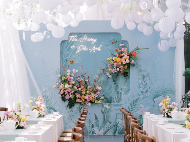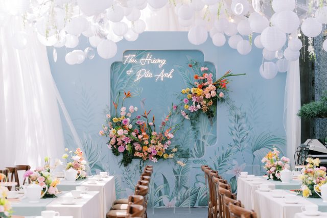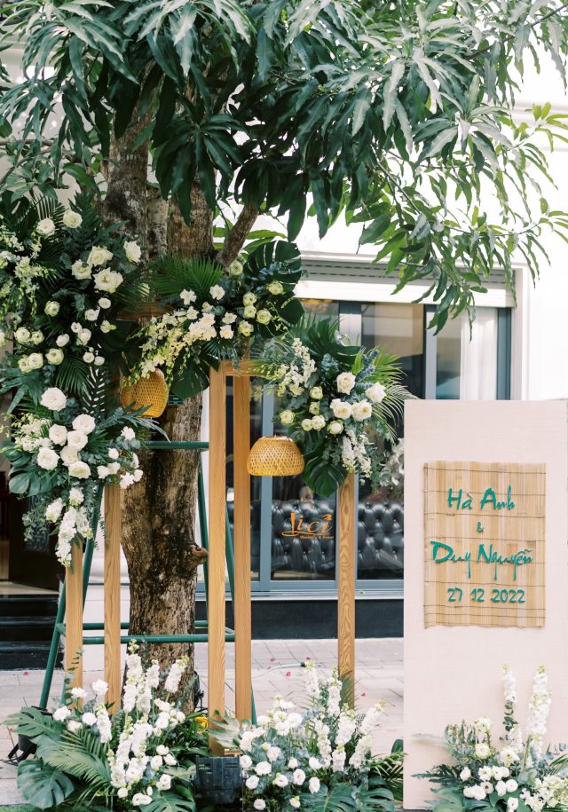 Trở về lời tựa đầu của một cuốn sách, vì hạ mới chỉ ghé sang, trang đầu tiên mới được giở để lắng nghe âm thanh của những điều đang tới. Đó cũng chính như đang giới thiệu về những chương tràn ngập hạnh phúc, bình yên trong cuộc sống hôn nhân của hai bạn sau này. Sắc hoa tươi nhẹ nhàng khi kết hợp cùng đa dạng các loại lá khiến không gian thể hiện được trọn vẹn tinh thần của concept mà không giấu đi sự thanh thoát tinh tế. Từng chi tiết trong buổi lễ như các khẩu phần tiệc tiếp đón quan viên hai họ được chuẩn bị chỉn chu và bài trí trang trọng.
