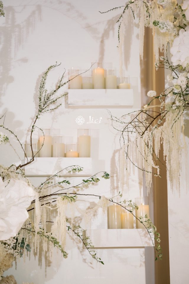 Sắc trắng của vải và hoa giấy được bố trí một cách khéo léo, hòa quyện cùng ánh sáng dịu dàng từ những ngọn nến lung linh, tạo nên một bức tranh vừa ấm áp vừa lãng mạn. Những cành hoa giấy mềm mại bay bổng như tượng trưng cho câu chuyện tình yêu của đôi bạn, nhẹ nhàng nhưng đầy sâu lắng.