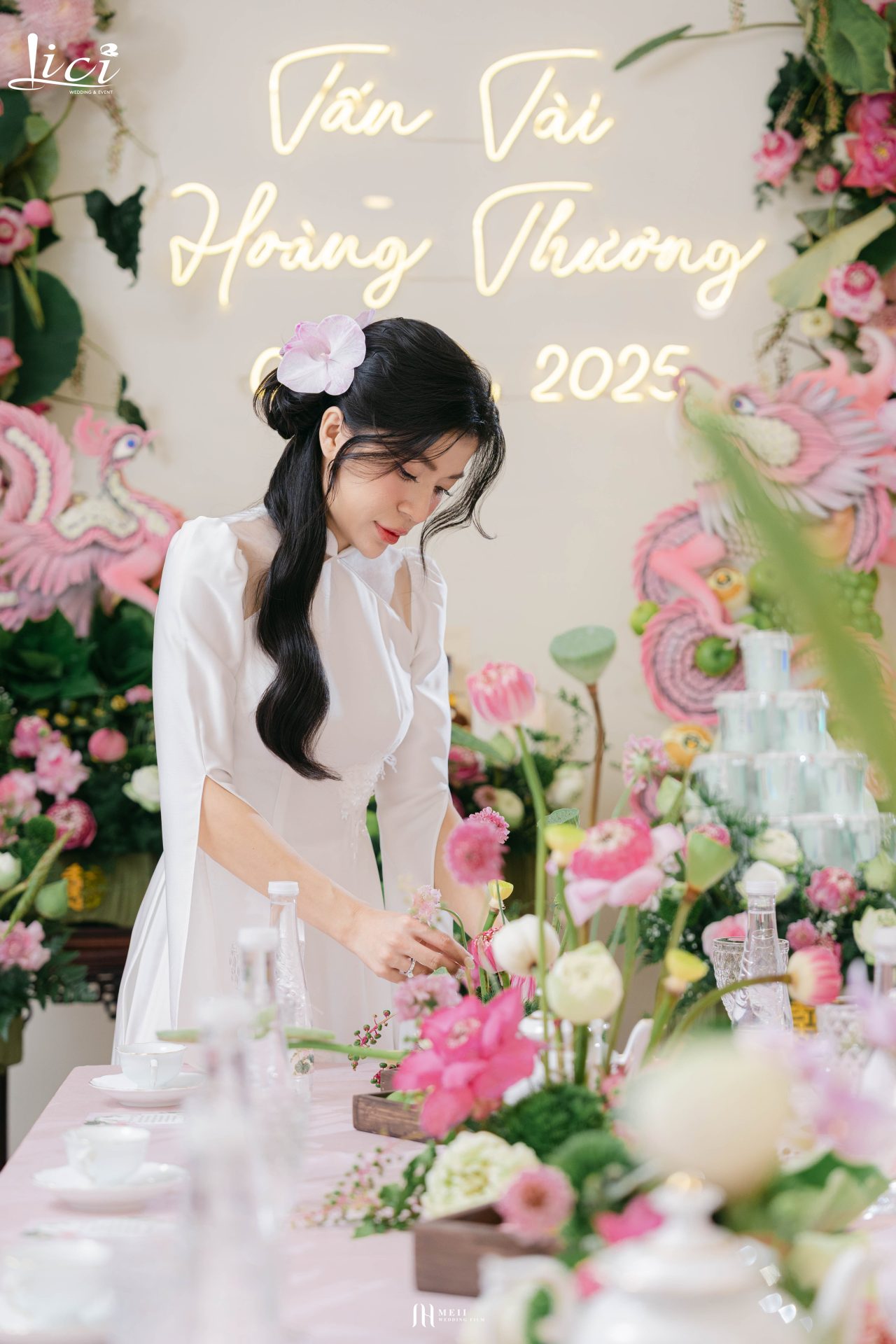 Những đóa sen hồng e ấp giữa không gian tiệc cưới, như đang kể về hành trình trưởng thành của tình yêu – từ bình dị đến lãng mạn, từ thử thách đến ngọt ngào. Sen không chỉ điểm tô cho ngày vui, mà còn trở thành biểu tượng cho sự kiên định và thuần khiết trong tình cảm đôi lứa.