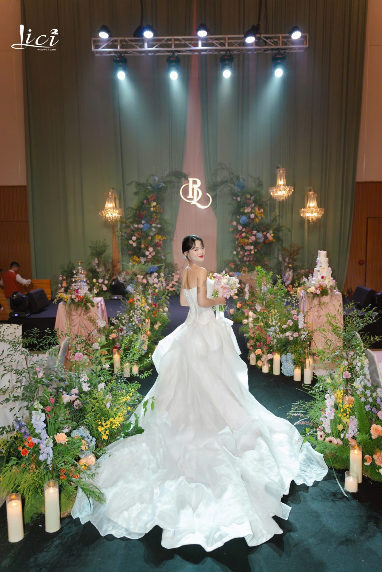 Lấy cảm hứng từ tinh thần “Garden of Whispers”, Lici gửi gắm vào thiết kế này hình ảnh một khu vườn thì thầm, nơi mọi sắc hoa đều mang tiếng nói riêng nhưng vẫn hòa vào nhau đầy nhịp nhàng. Không gian cưới được xây dựng như một bản hòa ca thị giác, rực rỡ, căng tràn sự sống nhưng vẫn giữ lại chất sang trọng mềm mại rất đặc trưng trong phong cách của Lici.