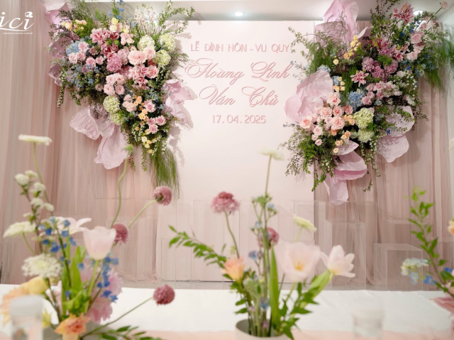 Chủ đạo là bảng màu pastel nhẹ nhàng – những tông hồng, kem, be được phối hài hòa trong các cụm hoa tươi nhiều tầng lớp. Hoa được sắp đặt theo cấu trúc chuyển động mềm mại, kết hợp cùng những dải voan hồng nhẹ như khói sương, tạo hiệu ứng thị giác uyển chuyển và đầy nữ tính. Đặc biệt, hoa giấy được tạo hình thủ công đã góp phần tăng thêm chiều sâu cho không gian, giúp phần backdrop tư gia không chỉ “đẹp để nhìn” mà còn thực sự chạm đến cảm xúc.