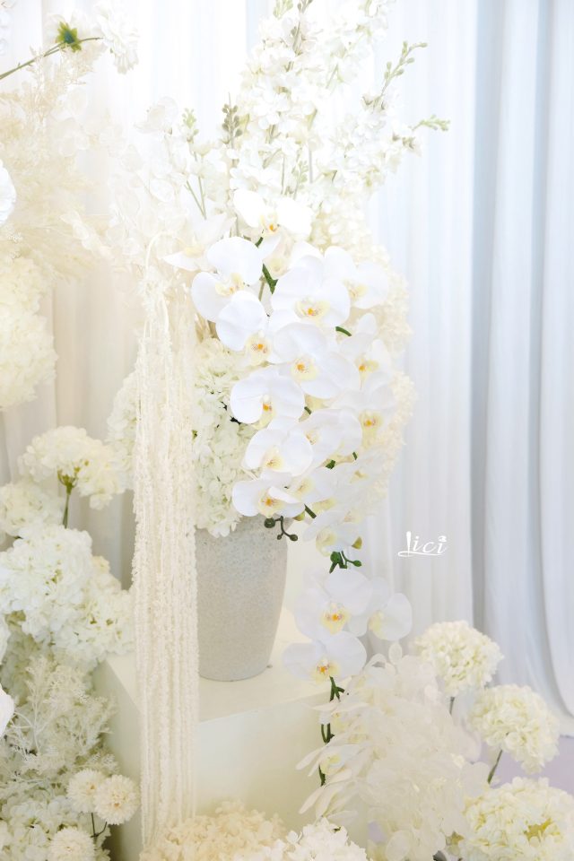 Điều khiến không gian này trở nên đặc biệt không chỉ nằm ở tone màu trắng thuần túy, mà còn ở cách các chi tiết được sắp đặt theo từng tầng, từng lớp. Như thể bạn đang lạc vào khu vườn địa đàng, nơi mỗi bước chân đều mang đến một trải nghiệm thị giác mới mẻ.