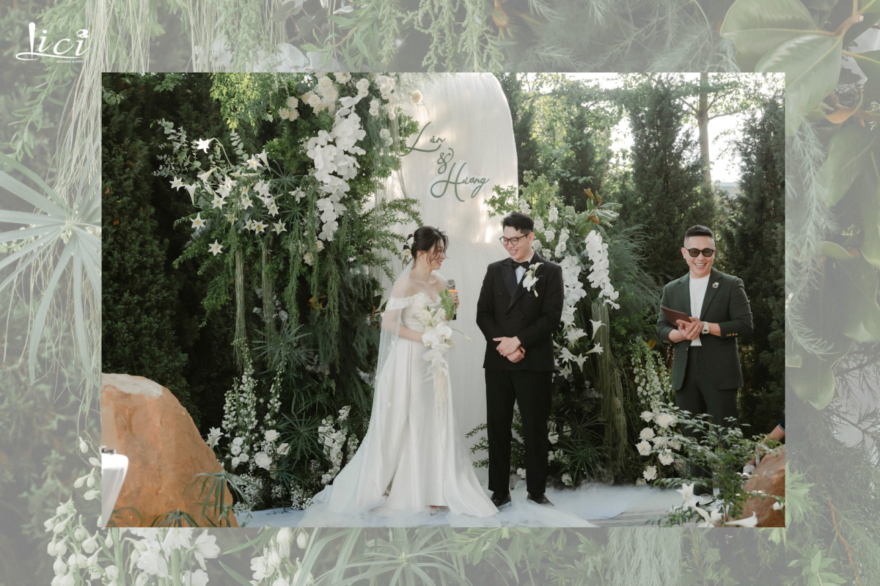 Lối đi phủ voan trắng, làn sương mờ lan nhẹ trên mặt đất như lớp mây vờn chân, làm dịu đi mọi ồn ào ngoài kia. Những khối đá tự nhiên, tán cây lớn và thảm hoa như mọc từ lòng đất… tất cả tạo nên một khung cảnh vừa hoang sơ vừa nên thơ. Trong không gian ấy, từng lời thề nguyện vang lên, không chỉ là lời hứa – mà là sự dâng hiến trọn vẹn cho tình yêu.
