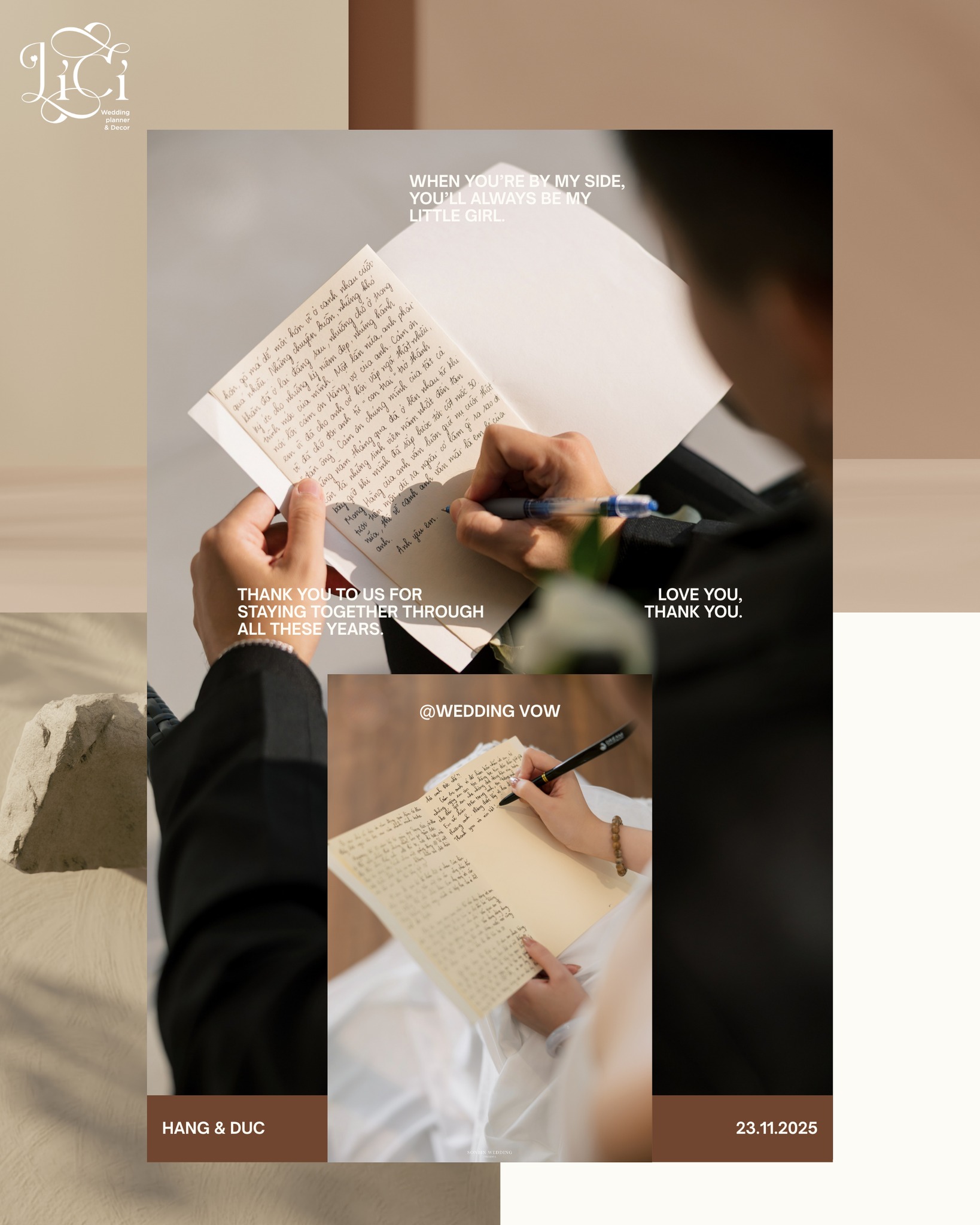 Lễ vow không chỉ là một nghi thức trong ngày cưới, mà là khoảnh khắc hai người thật sự dừng lại giữa tất cả những rộn ràng để nói với nhau những điều quan trọng nhất cho hành trình phía trước. Với kinh nghiệm đồng hành qua nhiều concept cưới khác nhau, Lici Wedding Planner luôn mong muốn giúp mỗi lễ vow trở thành một câu chuyện mang dấu ấn riêng của từng cặp đôi, không trùng lặp, không khuôn mẫu