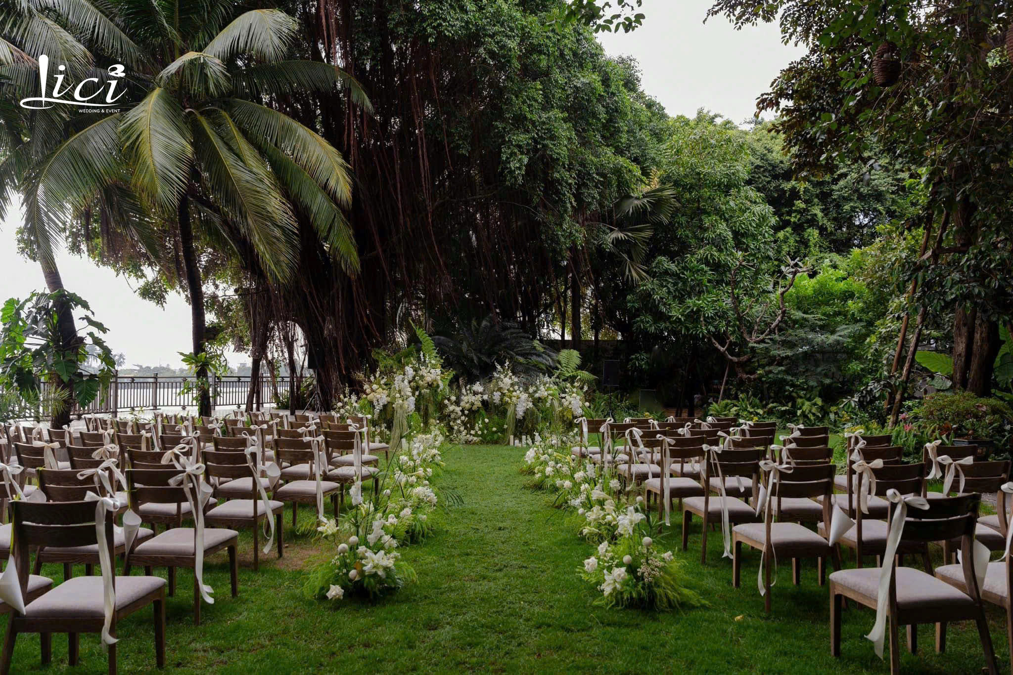 Những khoảng xanh dịu mát luôn mang đến một cảm giác rất gần gũi cho lễ vow, như thể mọi thứ được chậm lại, nhẹ đi một chút. Chỉ cần một cổng hoa tinh giản, vài hàng ghế nhỏ và ánh nắng khẽ chạm qua tán lá, không gian đã đủ để trở nên ấm áp và đầy cảm xúc.